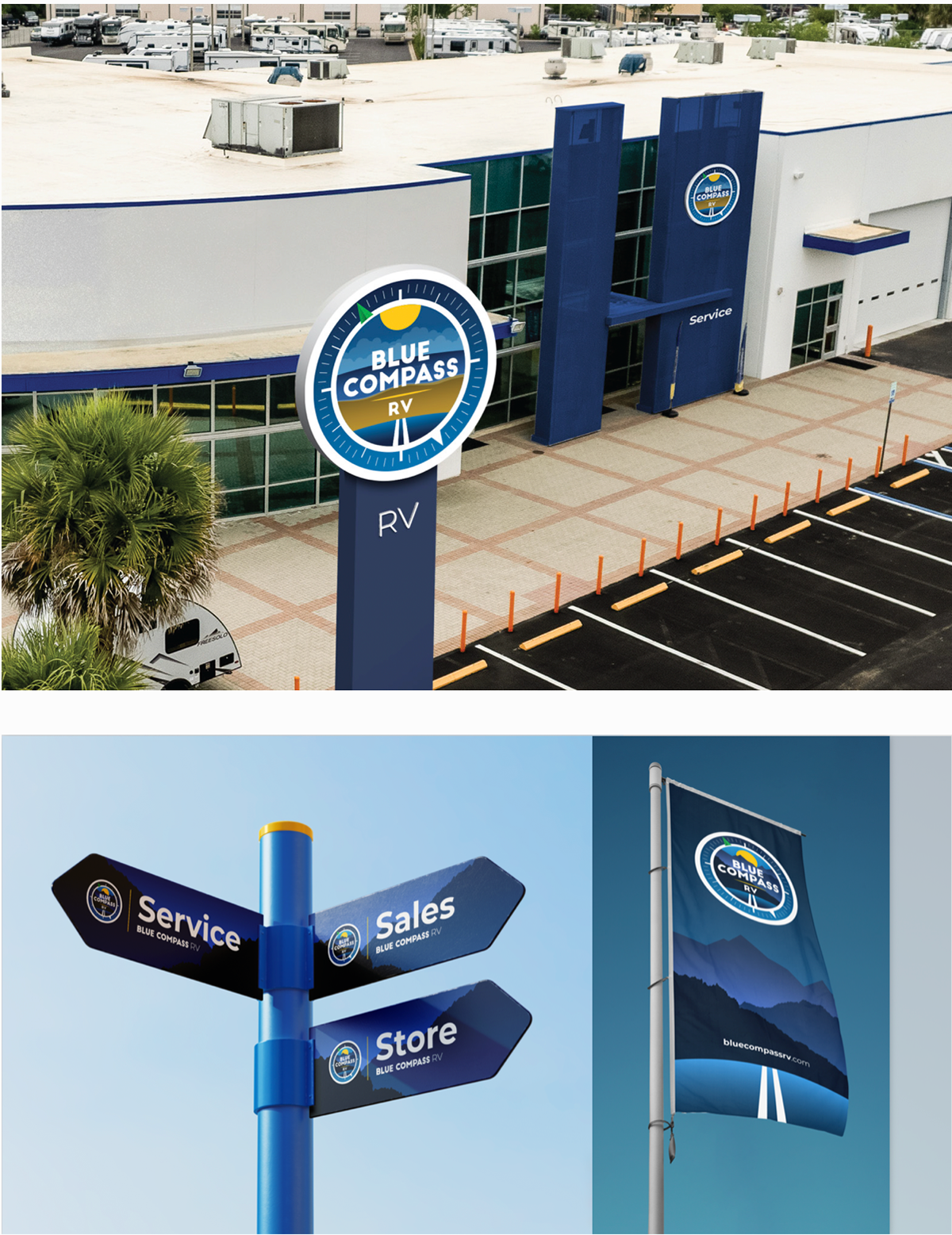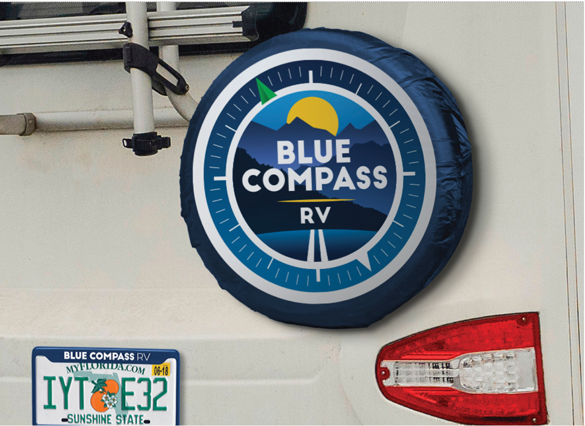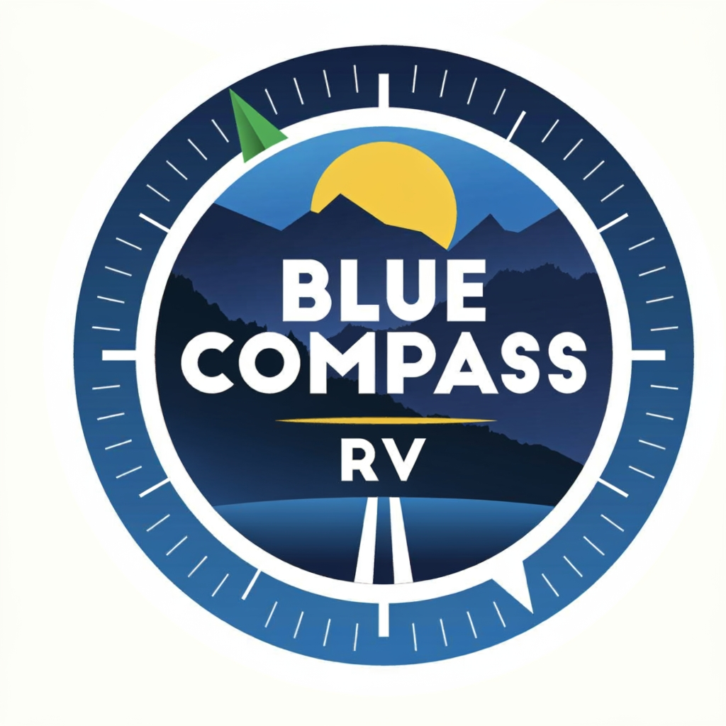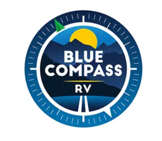 The logo is a reflection of the spirit of adventure found in nature. The blue evokes the calm serenity of lakes, oceans, and open skies. The golden sun, majestic mountains, and sweeping green landscape all symbolize the beauty and freedom of the great outdoors. At its heart, the compass represents the company's commitment to guiding RV enthusiasts at every stage of their journey, from purchase to service to unforgettable experiences, on and off the road. One is never lost with Blue Compass by their side.