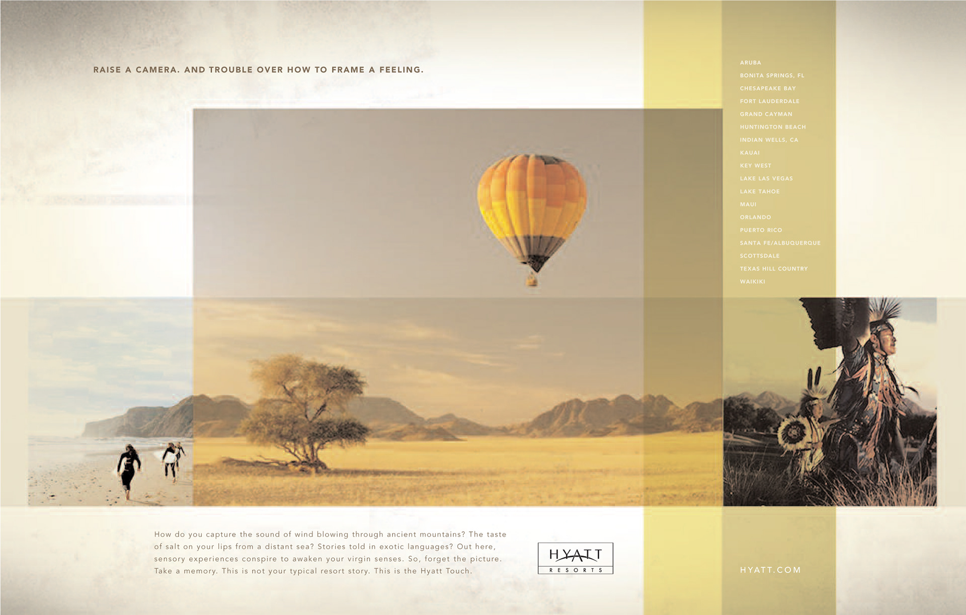 How do you capture the sound of wind blowing through ancient mountains? The taste of salt from a distant sea? Stories told in exotic languages? Out here, sensory experiences conspire to awaken your virgin senses. So, forget the picture. Take a memory. This is not your typical resort story. This is the Hyatt Touch.