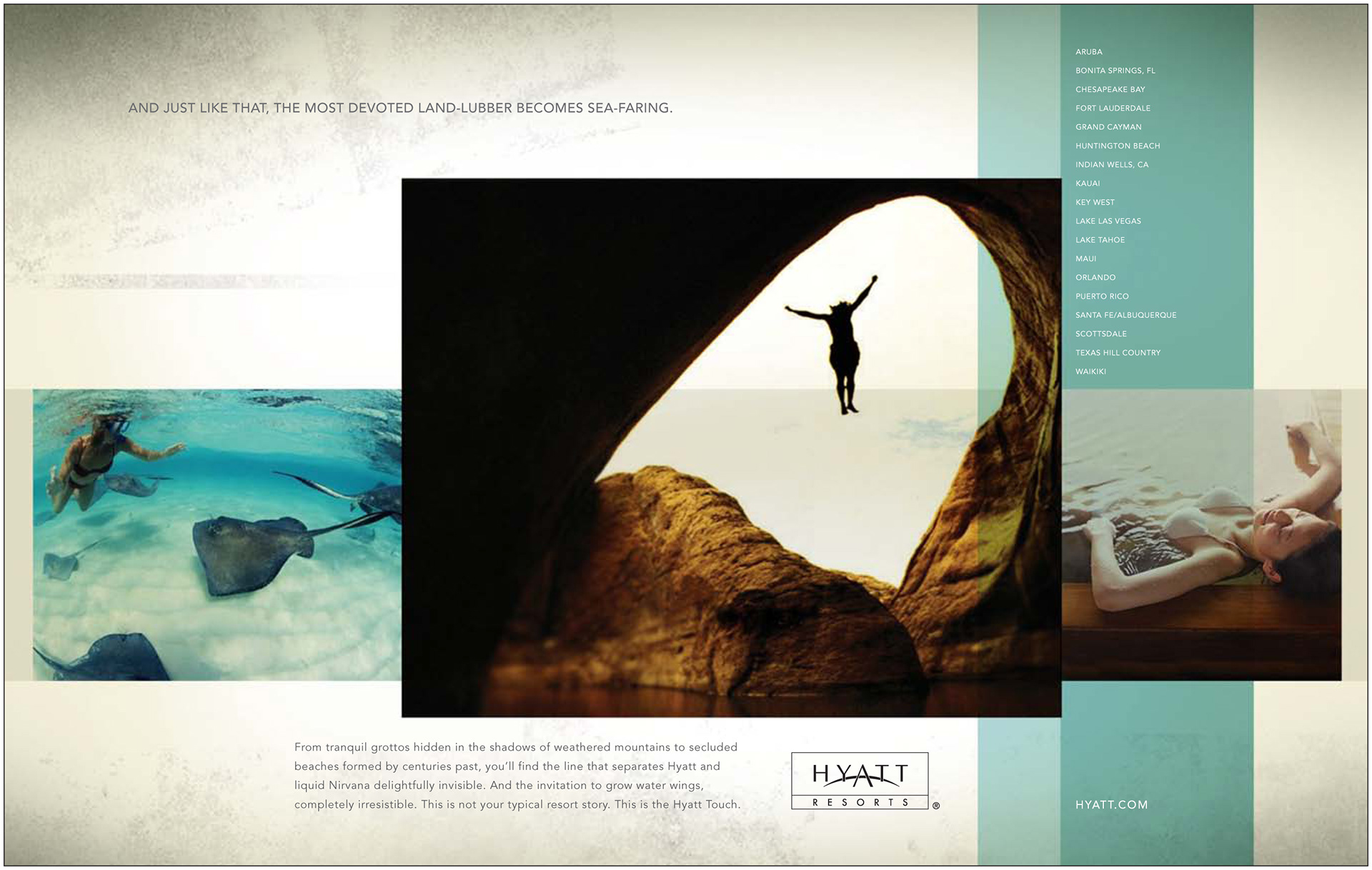 From tranquil grottos hidden in the shadows of weathered mountains to secluded beaches formed by centuries past, you’ll find the line that separates Hyatt and liquid Nirvana delightfully invisible. And the invitation to grow water wings, completely irresistible. This is not your typical resort story. This is the Hyatt Touch